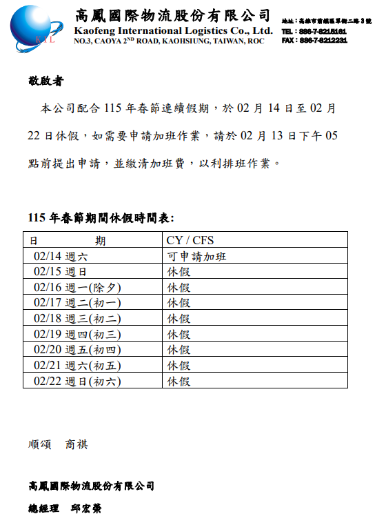 敬啟者 本公司配合 115 年 228 和平紀念日連續假期,作業時間表。
