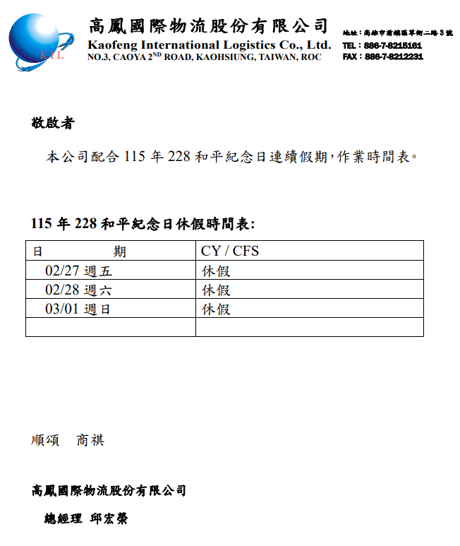 本公司配合 115 年春節連續假期,於 02 月 14 日至 02 月 22 日休假,如需要申請加班作業,請於 02 月 13 日下午 05 點前提出申請,並繳清加班費,以利排班作業。